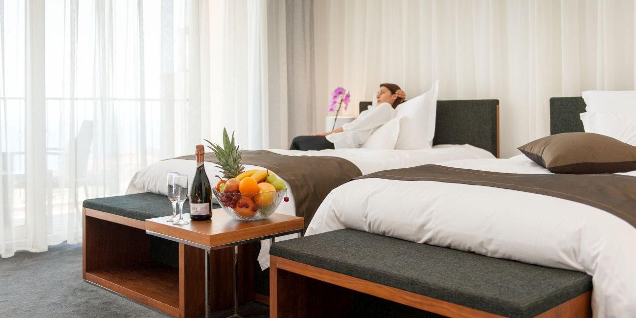Camerele sunt dotate cu balcon, baie cu dus si cada, minibar, aer conditionat, TV, telefon, uscatorie, room service si internet wireless. Toate camerele au posibilitati de vedere catre mare, terenul de golf, piscina sau gradina.