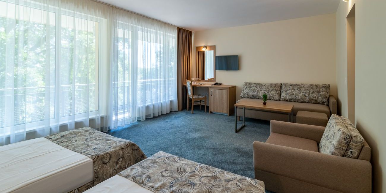 - Family Room - suprafata aprox. 30 metri patrati, o singura camera mai mare cu un pat matrimonial sau 2 paturi separate si 1 fotoliu extensibil sau canapea extensibila. Capacitate cazare min. 2 adulti, 2 +1; max 2+2 copii/3+1 copil sau 4 adulti + 1 infant. Camerele family sunt situate la etajele 2-4.