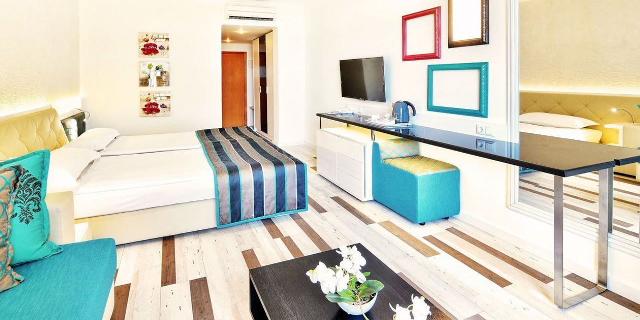Family Room (cu vedere la mare) - suprafata aprox. 49 metri patrati - living cu canapea extensibila si un dormitor cu pat matrimonial, despratite printr-o usa glisanta. Max.2+2/3+1 pers.