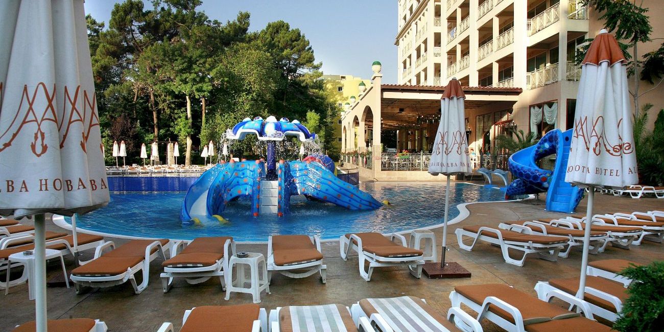 Hotelul Alba de 4 stele din Sunny Beach are o pozitie excelenta fiind situat pe vestita alee de promenada, la doar 50 de metri de plaja, in chiar centrul statiunii. In imediata proximitate se afla cele mai populare baruri, restaurante si atractii. Construit in 2003 si renovat in 2019, hotel Alba dispune de opt etaje, sapte lifturi si un total de 231 de camere spatioase.Cladirea impozante, curtea superba plina de verdeata si flori, camerele mari si luminoase, cele 2 piscine albastre, multitudinea de facilitati, un regim de masa all incusive diversificat si consistent si nu in ultimul rand serviciile de inalta calitate, fac din hotelul Alba o optiune deloc de neglijat in planificarea unei vacante de vara reusite pe litoralul bulgaresc impreuna cu familia, prietenii sau cu cei dragi.