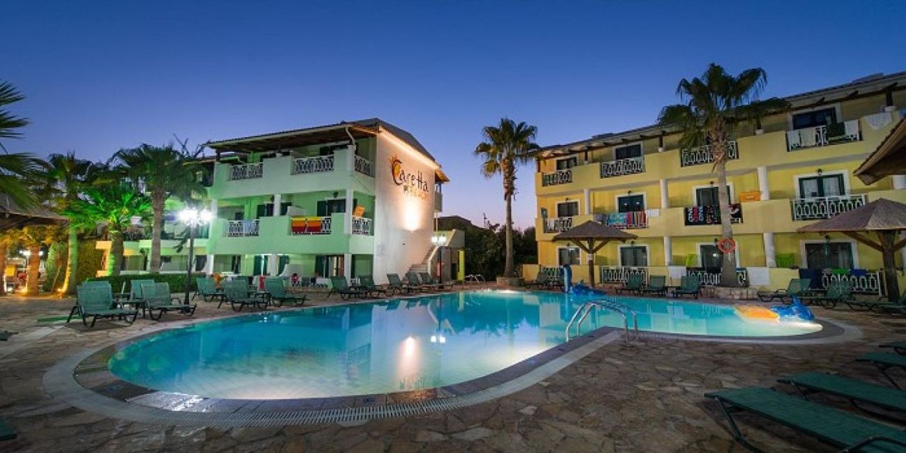 Caretta Beach Holiday Village de 4 stele din Zakyntos este un family hotel situat in statiunea Kalamaki, pe coasta de sud a insulei, la numai 4 km de capitala Zante si 2 km de aeroport. Complexul turistic se afla la numai 5 minute de renumita plaja unde isi au casa si mai renumitele testoase Caretta-Caretta. Avand in minte ca o vacanta ideala este o combinatie armonioasa dintre cazare confortabila, relaxare si distractie, arhitectul Aristotelis Marinos a proiectat si construit 9 corpuri difertie de cladiri cu un total de 238 de spatii de cazare, 5 piscine de dimensiuni diferite (incluzand piscina pentru jocuri, jacuzzi si piscine mari pentru copii) si din 2012 a fost inaugurat un Aqua Park imens si un Fun Park ce fac deliciul copiilor si nu numai. In ciuda marimii sale, Caretta Beach Hotel ofera o atmosfera relaxanta si pritenoasa, multiple facilitati de relaxare si distractie, un regim de masa All Incllusive bogat si variat si nu in ultimul rand servicii de calitate fiind foarte indragit de familiile cu copii dar si de grupuri de prieteni, turisti din toata lumea.