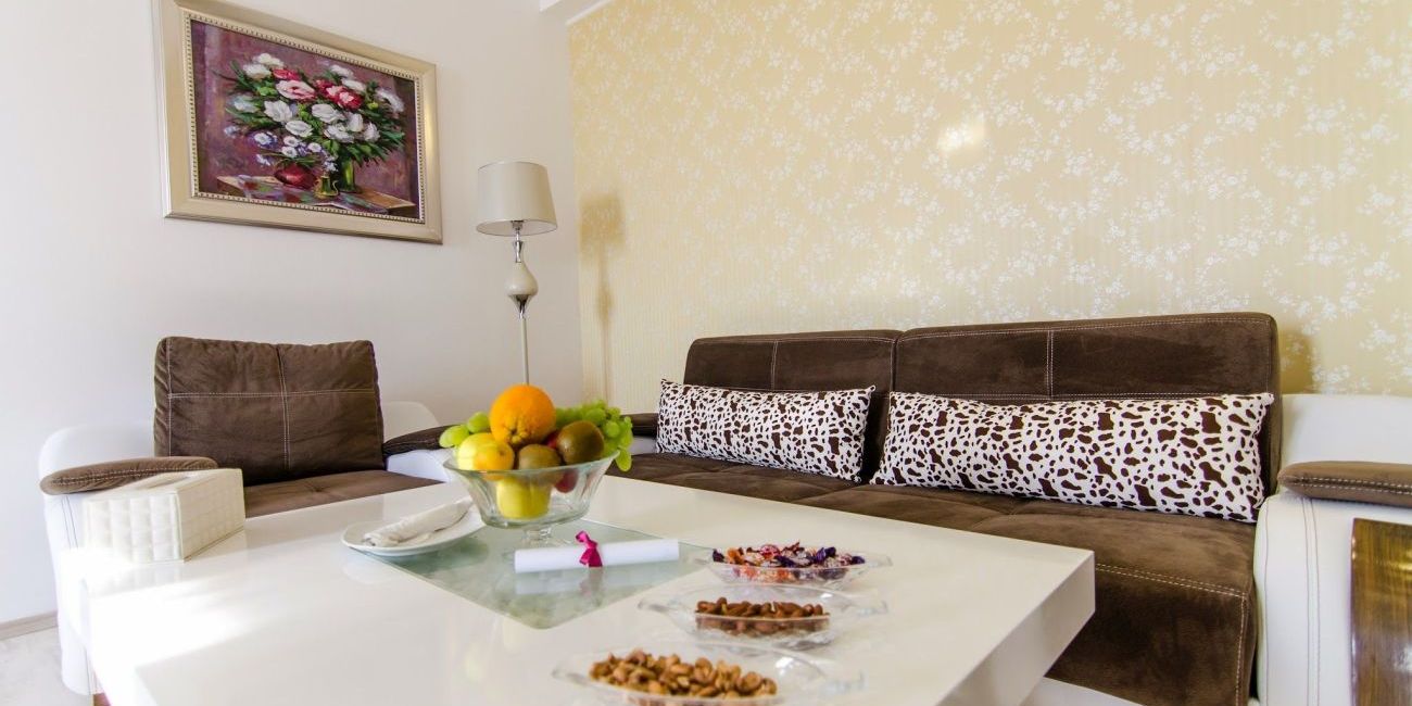 Apartament Standard (71m2) format din living cu canapea fixa si un dormitor cu pat matrimonial, baie cu cada, vedere frontala catre lacul Siutghiol;