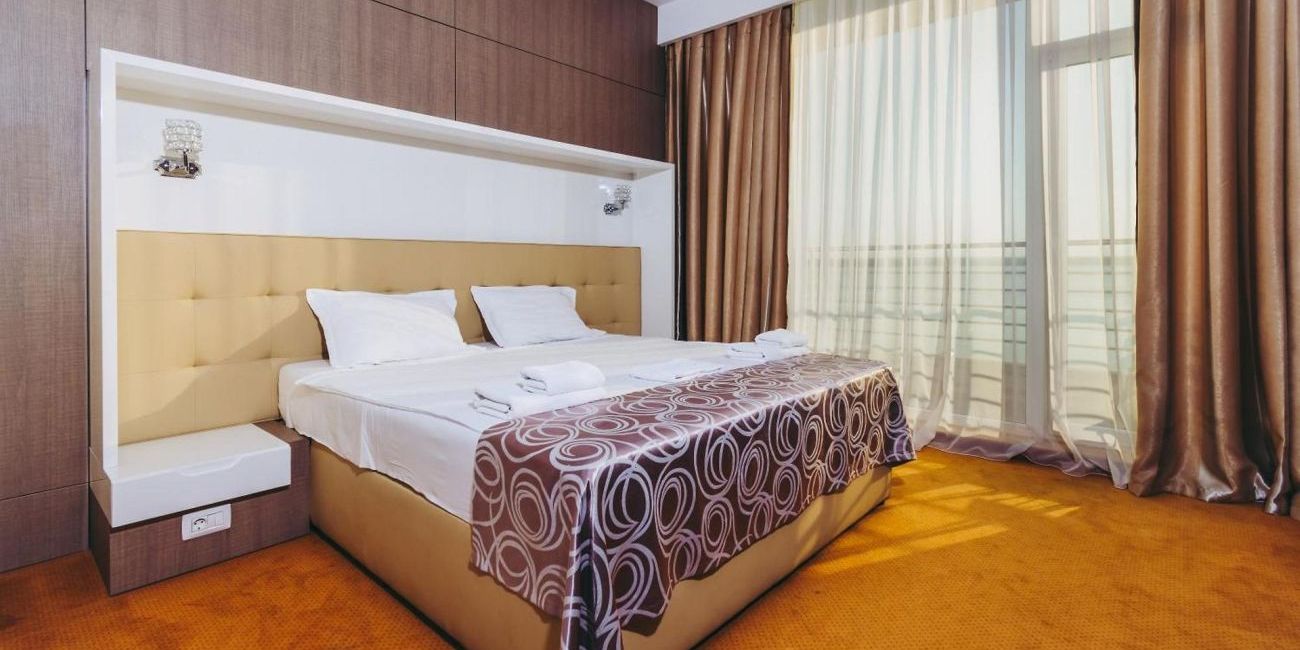 - Junior Suite: Confortabile si spatioase, suitele junior sunt alcatuite dintr-un dormitor cu 2 paturi de 1.40 x 2 m si un living cu canapea extensibila de 1.40 x 2 m. Dormitorul si livingul nu sunt separate prin usa. Suprafata junior suite: 40 mp. Capacitate maxima: 4 adulti si 2 copii in pat cu parinti