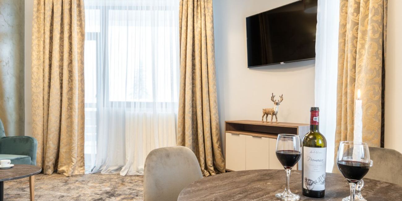 Toate camerele sunt dotate cu: living si dormitor, baie cu cabina de dus, uscator de par, TV LCD cablu, incalzire centrala, chicineta complet echipata, frigider, minibar, telefon, conexiune internet Wi-Fi, pardoseala cu mocheta, balcon