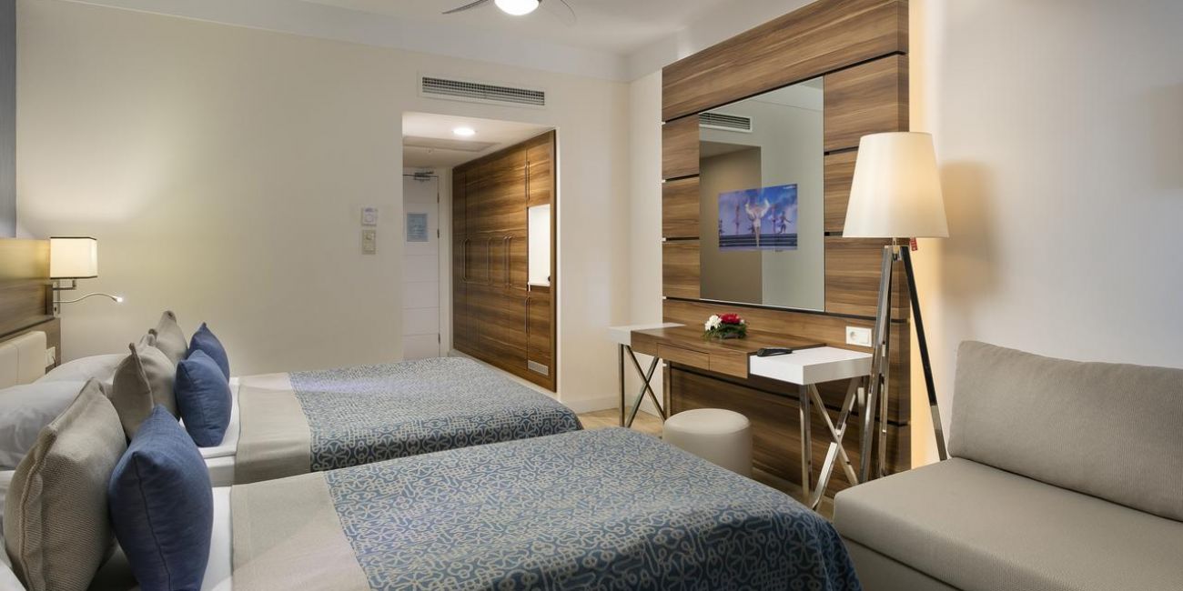 Hotelul Limak Atlantis Deluxe Resort dispune de un total de 466 de camere in cladirea principala si in cladirea Resort. In cladirea principala sunt 160 de camere standard,38 de camere extra standard ,10 camere duplex ,8 camere familiale,10 camere cu conexiune.In cladirea Resort sunt 91 camere standard,125 camere extra standard ,15 camere familiale.