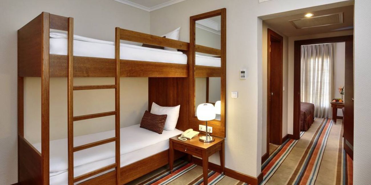 114 Camere Family - 28-38 metri patrati; capacitate maxima 5 pax; doua dormitoare cu pat dublu si paturi single, tv, balcon, baie proprie, telefon, wifi, seif, aer conditionat, mini bar, uscator de par