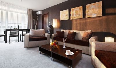 - Apartament Executive (2 paturi normale + 2 paturi extra; max 2+3 sau 3+2), cu o suprafata aprox. de 75 de metri patrati – doua camere separate de o usa: un dormitor cu pat matrimonial sau 2 paturi twin si o sufragerie cu o canapea extensibila dubla + un semineu. Acest tip de APP dispune de balcon.