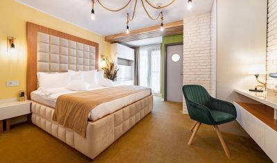 - Dubla Amyntas Deluxe - suprafata aprox. 17 metri patrati si balcon 2.5 metri patrati, pat matrimonial si vedere catre port si marina.