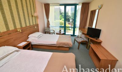 Hotel Ambassador de 3 stele din Nisipurile de Aur se afla la numai 30 de metri de plaja si 250 de metri de centrul statiunii. Complet renovat in 2002, Hotel Ambassador ofera oaspetilor sai conditii de cazare bune, un sistem de masa flexibil (cazare cu mic dejun sau cu demipensiune sau all inclusive), facilitati moderne si servicii de calitate.