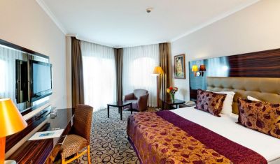 Toate camerele sunt dotate cu: baie, uscator de par, aer conditionat centralizat, televizor, telefon, minibar (apa si bauturi racoritoare zilnic, gratuit), seif in camera (gratuit), mocheta, balcon (nu in toate camere), room service (24 ore, contra cost).