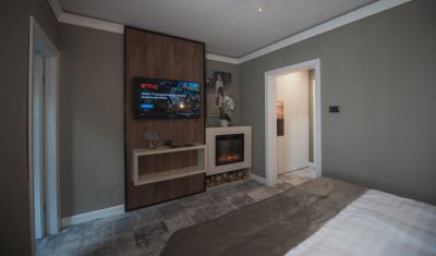 - Junior Suite, suprafata 30 mp; dotari: acces card, TV lcd, uscator de par, seif, halat, papuci, consumabile. Este compus din: 1 dormitor matrimonial, hol, baie, dormitor pat single. Sunt situate la etajul 3, si nu au balcon.