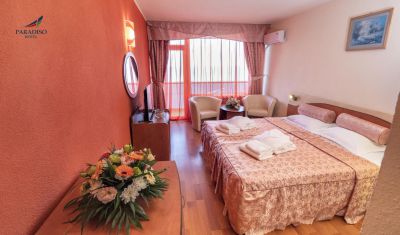 Hotel Paradisio de 3 stele din Mangalia se afla la numai 25 de metri de plaja, pe faleza de promenada a statiunii, iar pozitionarea sa perpendicular pe linia marii determina ca toate cele 273 de camere sa dispuna de o vedere spectaculoasa catre mare. Hotelul Paradiso (cunoscut in trecut ca Mangalia - Siemens) ofera o gama foarte larga de terapii si tratamente avand una din cele mai mari si complexe baze de tratament balnear si de recuperare, de pe litoral si din tara deservita de un colectiv de medici si terapeuti profesionisti cu o bogata experienta in domeniu. Complet renovat, cu o pozitionare de invidiat si cu servicii de calitate, Hotel Paradiso reprezinta o alegere perfecta pentru turistii care doresc o vacanta frumoasa pe litoral si in acelasi timp sa isi ingrijeasca sanatatea.